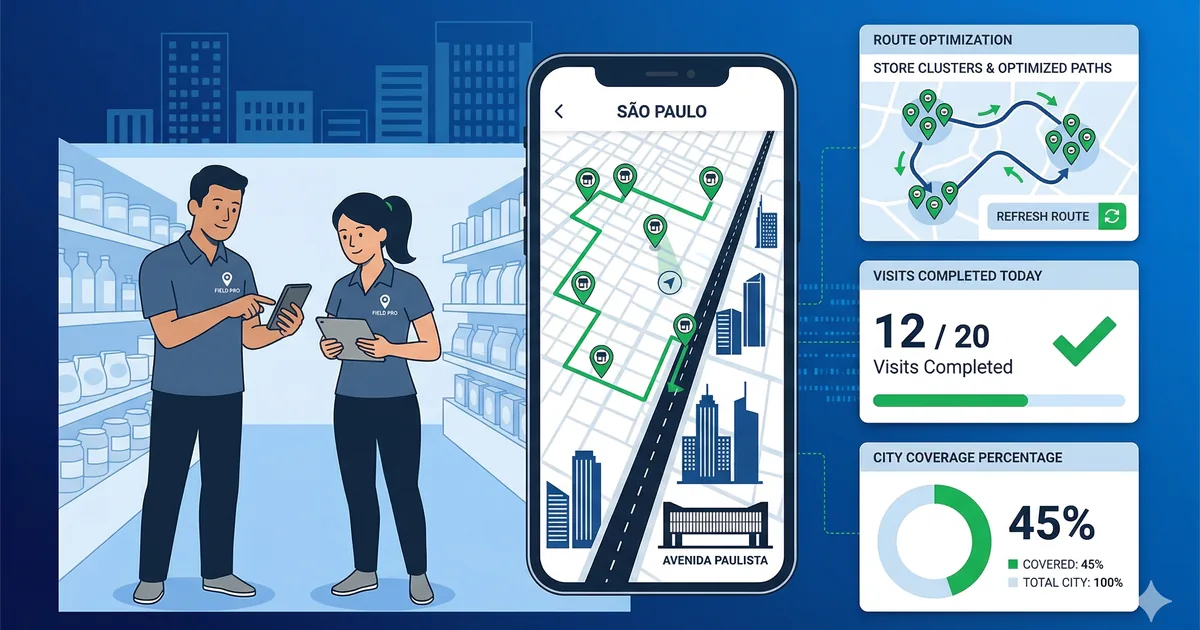 São Paulo tem mais de 600.000 pontos de venda, trânsito imprevisível e distâncias que transformam um roteiro de 6 visitas em uma maratona de 10 horas. Gerenciar equipe de campo aqui exige mais do que um bom supervisor — exige gestão equipe campo são paulo com tecnologia, dados e planejamento preciso.